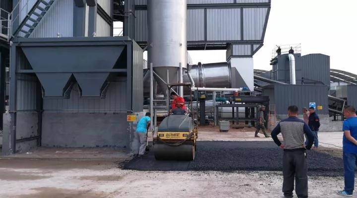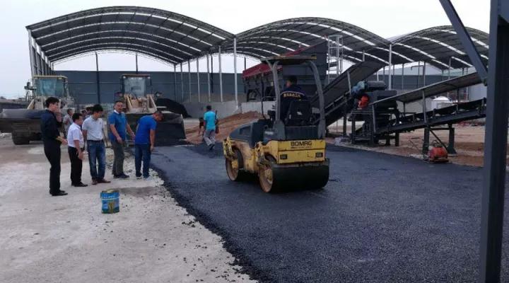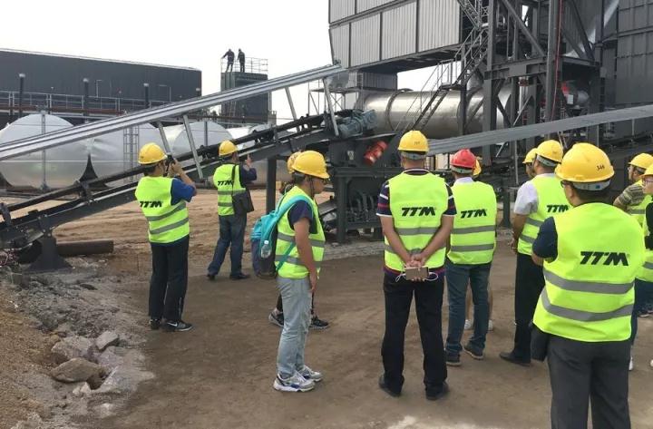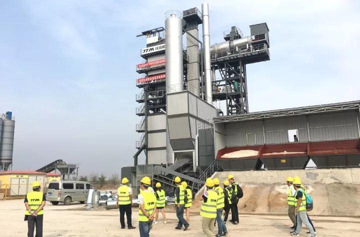 此次接受“檢閱”的是鐵拓機械TS3015型瀝青廠拌熱再生成套設備。領導一行乘坐大巴抵達工地時,設備已經順利調試成功,正處于開機試生產階段,將于不久投入正式運營。