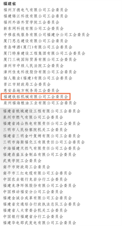 近日,全國(guó)總工會(huì)印發(fā)了《關(guān)于表彰全國(guó)模范職工之家 全國(guó)模范職工小家 全國(guó)優(yōu)秀工會(huì)工作者和命名全國(guó)優(yōu)秀工會(huì)積極分子 全國(guó)優(yōu)秀工會(huì)之友的決定》文件。其中,福建省有70個(gè)集體、73位個(gè)人受到全國(guó)總工會(huì)表彰,鐵拓機(jī)械榮獲“全國(guó)模范職工之家”稱號(hào)。