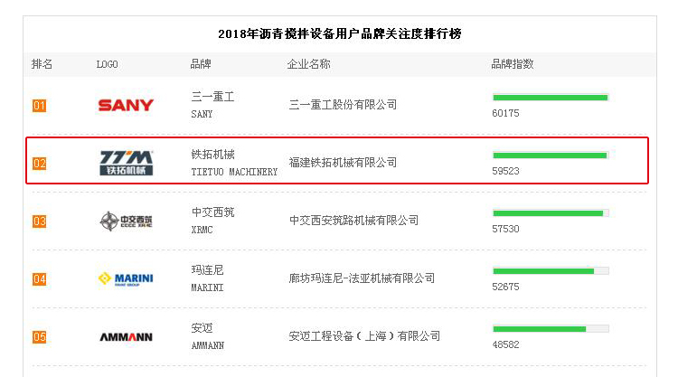 2019年1月10日,中國路面機械網在北京發布了《2018年中國工程機械用戶品牌關注度排行榜》。鐵拓機械榮登“2018年中國瀝青攪拌設備品牌關注度十強”榜單。